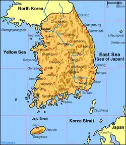 - en Principalele orașe din Coreea de Sud Arhivat în , la Wayback Machine., imagini din satelit și coordonate geografice