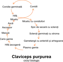Ciclul de dezvoltare al speciei de ciupercă parazită Claviceps purpurea[24], începe în spicele de secară. Aici în locul unor boabe se formează formațiuni tari care sunt scleroții acestei ciuperci parazite. Acești scleroți sunt organe de rezistență ai ciupercii. De pe spicul de secară ei cad pe pământ. Fiind organe de rezistență, deci adaptați la condiții vitrege, aceștia rezistă până primăvara.