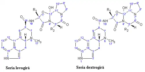 Alcaloizi peptidici: prin oxidarea lor se pune în libertate: acid lisergic sau izolisergic, cetoacid R1 și un aminoacid R2. Aceștia se clasifică în: