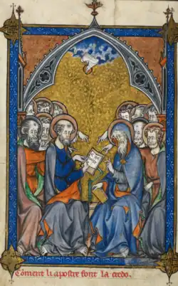Miniatură dintr-un manuscris din secolul al XIII-lea care îi arată pe Apostoli în timp ce redactează Crezul, fiind inspirați de Sfântul Duh.