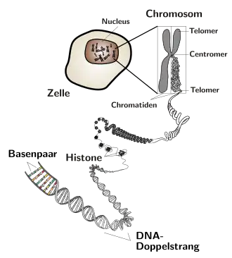 În timpul diviziunilor celulare, mitotice sau meiotice, cromatina se condensează puternic și formează cromozomii. Astfel, cromatina interfazică și cromozomii sunt două stări diferite de condensare ale aceleiași structuri nucleoproteice. Cromozomii mitotici sunt formați din două structuri paralele numite cromatide surori unite printr-o regiune numită centromer. Fiecare cromatidă este formată de o moleculă de ADN asociată cu proteine ce permit condensarea ei.[1]