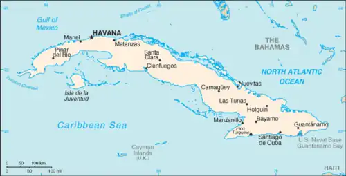 Cuba (Republica Cuba, în spaniolă República de Cuba) este o țară insulară din nordul Americii Centrale, situată pe cea mai mare insulă din Antile (Cuba), Isla de la Juventud și câteva arhipelaguri. Se află la confluența Mării Caraibelor, Golfului Mexic și Oceanului Atlantic. La nord se află SUA și Bahamas, la vest - Mexic, la sud - Insulele Cayman și Jamaica, iar la sud-est - Haiti. Capitala și cel mai mare oraș din țară este Havana. Al doilea oraș ca mărime este Santiago de Cuba.[10][11][12]