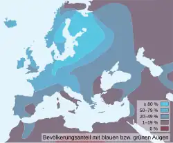 Această repartiție nu este omogenă. Mai întâi, în Europa, se observă mari diferențe între jumătatea de Nord (Scandinavia, Regatul Unit, Islanda, Țările Baltice, Rusia de Vest), unde peste 80% din populație are ochii albaștri și unde Finlanda are procentajul cel mai ridicat din lume, în timp ce în țările mediteraneene, această proporție cade cu mult sub 20%, în pofida unei prezențe în Algeria, Turcia, Iordania, Maroc, precum și în Caucaz.