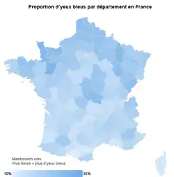- ↑ fr Meetcrunch Comment se répartissent les yeux bleus en France? Arhivat în , la Wayback Machine. Étude de fréquence des yeux bleus., 31 octobre 2012.