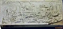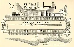 În Roma Antică, întrecerile carelor de luptă aveau loc la circus[27]. Locul principal de desfășurare a curselor era Circus Maximus, situat în valea dintre dealurile Palatin și Aventin[N8], care putea găzdui între 150.000 și 180.000 de spectatori[25]. A fost primul dintre circurile Romei[27] și se presupune o datare undeva la începuturile orașului[N9], greu de datat concret pentru că a fost reconstruit de Iulius Cezar în jurul anului 50 î.e.n. Lungimea sa era de 650 m iar lățimea de aproximativ 125 m[28]. Unul dintre capetele pistei era deschis, spre diferență de celălalt, aici fiind și punctul de aliniere al carelor pentru startul în cursă. Romanii utilizau și ei o serie de porți denumite carceres, un echivalent al grecului hysplex. Acestea erau ridicate asemănător hysplex dar erau ușor diferite pentru că pista romană dispunea de o linie mediană continuă (spina) în centru[29]. Ca și la greci, Carceres preluau din dezavantajul culoarului exterior de la capătul pistei unde se executa întoarcerea[30] iar la start carele erau dispuse în spatele acestor porți cu arc. Când totul era pregătit, împăratul (sau cel care găzduia cursa, daca nu erau în Roma) dădea drumul unui obiect de îmbrăcăminte cunoscut sub numele de mappa, semnalizând astfel începutul cursei[31]. Porțile cu arc se deschideau secvențial, creând un început de cursă echitabil pentru toți participanții.