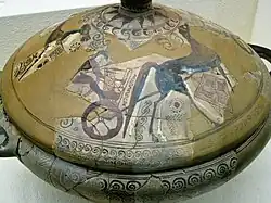 - N1 Un număr de fragmente redau două sau mai multe care aflate vădit în mijlocul unei curse. Conform lui Bennett, este o indicație clară că aceste competiții existau ca sport încă din secolul XIII î.e.n. Cursele de care de luptă sunt de asemenea reprezentate pe vasele perioadei târzii a artei geometrice[67].