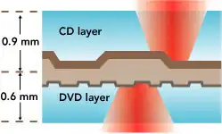 Pentru citirea discurilor DVD, sunt necesare lasere care produc raze cu o lungime de undă mai mică, având mecanisme de focalizare mai precise. Focalizarea mai precisă este de fapt cea care permite înregistrarea datelor pe două straturi. Pentru citirea celui de-al doilea strat, se realizează focalizarea fasciculului în adâncimea discului, unde se află acest strat.