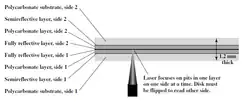 Citirea informației de pe un substrat sau de pe celălalt se face prin focalizarea fascicolului laser. Când raza laser nu este focalizată, aceasta cuprinde o arie mai largă și aparatul nu o percepe. Raza citește doar stratul asupra căruia este exact focalizată. Pista spiralată a DVD-ului este ștanțată mult mai strâns pentru a-i conferi o capacitate mai mare, șanțurile fiind situate la o distanță de 0,74 micrometri. Laserul care citește discul are o lungime de undă de 635 până la 650 nanometri.
