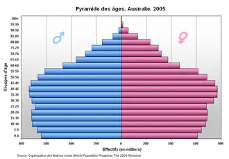 La fel ca toate țările puternic dezvoltate, Australia prezintă o îmbătrânire a populației, cu tot mai mulți pensionari și o forță de muncă mai scăzută. Un număr mare de australieni (759.849 pentru perioada 2002–2003) trăiește în afara țării.