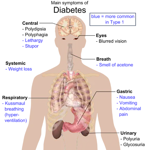 Incidența diabetului a crescut considerabil în decursul ultimilor 50 de ani, în paralel cu cea a obezității. În 2010 existau aproximativ 285 de milioane de oameni care sufereau de această boală, în comparație cu aproximativ 30 de milioane în 1985. Complicațiile pe termen lung provocate de glicemia ridicată pot include afecțiuni ale inimii, accidente vasculare, retinopatie diabetică în care este afectată vederea, insuficiență renală ce poate necesita dializă, și circulație deficitară a membrelor, care poate duce la amputare. Complicația severă reprezentată de cetoacidoză, o caracteristică a diabetului tip 1, are o frecvență redusă.[4] Cu toate acestea, se poate produce coma diabetică hiperosmolară fără cetoacidoză.