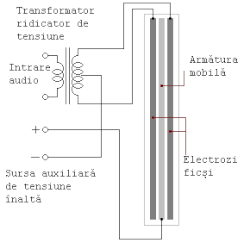 Acest tip de difuzor se poate compara cu un condensator. Este constructiv compus dintr-un electrod fix și un electrod mobil (se pot numi fiecare și armătură). Sunt confecționați dintr-o peliculă dielectrică foarte subțire, metalizată pe una din părți. Între cei doi electrozi se aplică o tensiune continuă care creează câmpul electric inițial. La aplicarea tensiunii alternative de audiofrecvență, armătura mobilă va vibra, producând sunete.