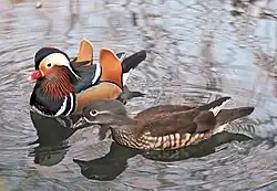 Dimorfismul sexual se poate manifesta la păsări în diferențe de mărime sau de penaj. Diferențele de mărime variază între specii, dar nu sunt regulă, în general păsările de pradă sau anumite specii de păsări nezburătoare nefiind diferențiate.[34] Diferențele de penaj, ca ornamentație sau culoare, de asemenea variază, dar în general masculii sunt mai ornamentați și prezintă culori mai vii.[35] Astfel de diferențe au fost atribuite contribuțiilor inegale din partea partenerilor sexuali.[36] În anumite specii, contribuția mascului se termină la sfârșitul copulării, în timp ce la alte specii mascului îngrijește urmașii. Diferitele forme de penaj au evoluat pentru a reflecta aceste diferențe și alte măsuri a valorii reproductive, cum ar fi condiția fizică[37] sau supravietuirea.[38] Fenotipul masculin trimite semnale femelei, care apoi alege cel mai „potrivit” mascul disponibil.