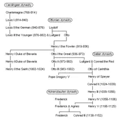 După stingerea Dinastiei Ottoniene, odată cu moartea împăratului Henric al II-lea în 1024, tronul imperial a fost preluat de Dinastia Saliană. Liutgarda, fiica împăratului Otto I s-a căsătorit cu ducele salian Conrad de Lorena (supranumit cel Roșu). Nepotul său a fost împăratulul Conrad al II-lea (în germană Konrad II.).