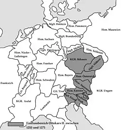 În cea de-a doua jumătate a secolului al XIII-lea, Přemyslid a fost una dintre cele mai puternice dinastii din Europa Centrală.[2] Regele Ottokar al II-lea, fiul lui Venceslau I, a câștigat porecla de "Regele de Fier și de Aur" din cauza puterii sale militare și a bogăției.[1] După mai multe războaie victorioase cu Regatul Ungariei, el a dobândit Austria, Stiria, Carintia și Carniola, extinzând astfel teritoriul boem până la Marea Adriatică. Ei au fost atât de puternici, încât regele Ottokar al II-lea aspira la coroana imperială a Sfântului Imperiu Roman. Aceste aspirații au început conflictul cu Casa de Habsburg, care erau, până atunci, prinți puțin cunoscuți. Reprezentantul lor Rudolf a fost ales ca rege al romanilor. Ottokar al II-lea a luptat cu Rudolf în mai multe războaie. În Bătălia de la Marchfeld (1278), oștile lui Ottokar s-au ciocnit cu armatele imperiale și maghiare. În plus, el a trebuit să facă față trădării nobilimii boeme. A fost ucis în luptă[1] și Habsburgii au dobândit Austria, pe care au condus-o până în secolul al XX-lea.