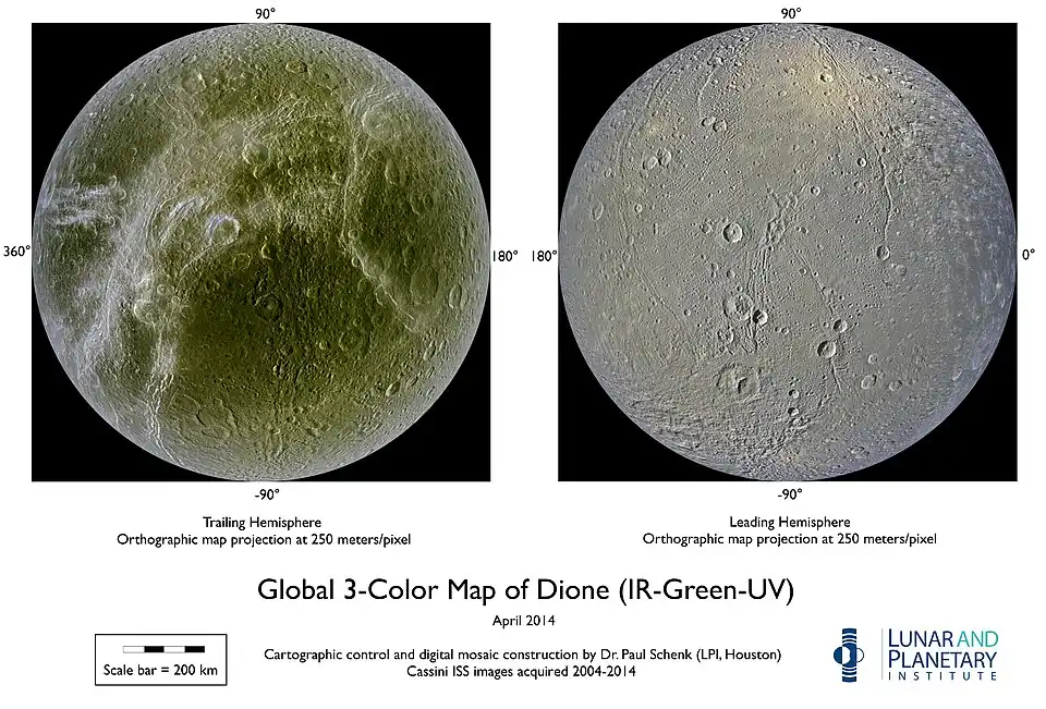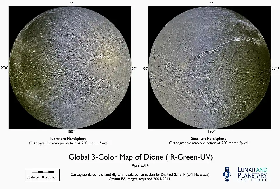 - Hărți de bază Dione globale Arhivat în , la Wayback Machine. și polare (decembrie 2011) din imaginile Cassini