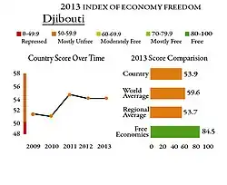 Economia din Djibouti este concentrată în sectorul serviciilor. Datorită precipitațiilor reduse, legumele și fructele sunt principalele culturi de producție, alte produse alimentare necesitând import. PIB-ul din 2012 a fost estimat la 2.377 miliarde USD, cu o rată de creștere reală de 4,8% anual. Venitul pe cap de locuitor a fost de aproximativ 2.700 dolari. Din 2013, terminalul de containere din portul Djibouti ocupa cea mai mare parte a schimburilor comerciale a țării. Aproximativ 70% din activitatea portului maritim constă în importurile și exporturile țării vecine, Etiopia, care depinde de acest port ca ieșire maritimă principală. De asemenea portul servește ca centru de realimentare internațional și totodată ca centru de transbordare. în 2012, guvernul Djiboutian, în colaborare cu DP World [4] a început construcția la Doraleh Container Terminal, un important port maritim ce vizează dezvoltarea capacității naționale de tranzit. Un proiect de 396 milioane USD, care are capacitatea de a găzdui 1,5 milioane de douăzeci de unități de containere anual.