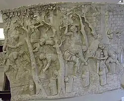 Construcția unui drum roman, scenă pe o metopă aflată pe Columna lui Traian.