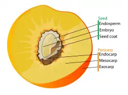 - Pericarpul (este o parte dură și sclerificată a miezului, în care se adăpostește sămânța; împreună cu sămânța, pericarpul formează ceea ce în limbajul uzual se numește sâmbure)