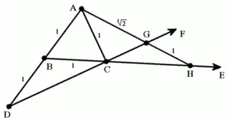 Una din aceste metode necesită folosirea unei rigle care să aibă distanța egală cu unitatea. Se construiește un triunghi echilateral ABC cu latura unitară. Se prelungește tot cu unitatea și fie D simetricul lui A față de B. Se plasează rigla în vârful A astfel încât să intersecteze semidreptele și în G, respectiv H, astfel încât segmentul să aibă extremitățile chiar în punctele marcate (între care distanța este unitară): .