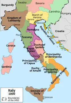 Populație germanică, longobarzii au invadat nordul Italiei în anul 568, cucerind cea mai mare parte a sa și constituind Regatul longobarzilor, divizat în câteva ducate dependente de un rege, care și-a stabilit reședința la Pavia în 572. În anii următori, ei au cucerite de asemenea și pățile centrală și sudică ale Peninsulei Italice, inclusiv importantul centru Spoleto în 570, situat în ceea ce astăzi constituie provincia Umbria.