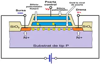 La tranzistoarele utilizate în celule de memorie la un circuit EPROM, mai există suplimentar încă un strat conductor, aflat între poarta de comandă și canalul prin care pot sa circule sarcini electrice, izolat suplimentar cu ajutorul oxidului de siliciu .[6] Această poartă suplimentara este o „poartă flotantă”, o structură încorporată în stratul dielectric care izolează canalul de siliciu al unui tranzistor MOSFET și poarta externă a fiecărui tranzistor din celula de memorie. Tranzistorul cu poartă flotantă este conceput pentru a stoca o cantitate de sarcini electrice, care este utilizată pentru a determina dacă bitul de date stocat în celula de memorie este „1” sau „0”. Deoarece poarta flotantă este înconjurată de , care este un izolator excelent, sarcina prinsă poate fi stocată mulți ani, chiar și atunci când tensiunea de alimentare este îndepărtată, creând mecanismul de stocare nevolatil.[7]