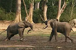 Jocul la puii de elefant diferă între sexe; femelele se aleargă sau se fugăresc în timp ce masculii luptă în joacă. Primele sunt mature sexual(d) la vârsta de nouă ani,[133] în timp ce aceștia din urmă devin maturi în jur de 14–15 ani.[121] Elefanții de ambele sexe pot fi considerați adulți de la vârsta de 18 ani.[144][145] Elefanții au o viață lungă, ajungând la vârsta de 60–70 de ani.[76] Lin Wang, un elefant mascul asiatic în captivitate, a trăit 86 de ani.[146]