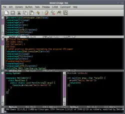 ![]() GNU Emacs 22.0.91.1 with multiple buffers and syntax highlighting for LaTeX, C#, and C. | |