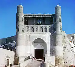 Poarta de intrare în palatul emirului din Bukhara. Fotografie făcută ca. în 1912 de Sergei Mikhailovich Prokudin-Gorskii.