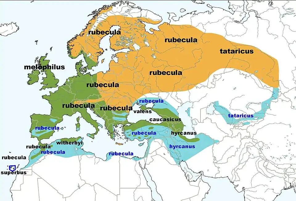 - Subspecia nominată E. r. rubecula (Linnaeus, 1758). Cuibărește în Azore, Madeira, vestul Insulelor Canare (La Palma, Gomera, El Hierro), centrul, sudul și estul Europei, la nord până în nordul Scoției (cu excepția insulelor Shetland) și Scandinavia (continuu spre nord până la latitudinea nordică 70°, sporadic până la Capul Nord), la est în Rusia, ajungând la nord până la Kandalakșa, Marea Albă și la est până în Urali (în principal la latitudinea nordică 45–67°); a cuibărit și în Insulele Feroe. În sudul Europei cuibărește în sudul Portugaliei, Spania până în Maroc (la sud până la Atlasul Înalt), Italia, Grecia și nordul și nord-vestul Turciei, mai la nord în jurul Mării Negre în România și Republica Moldova, în vestul și nord-centrul Ucrainei. Intergradează cu subspecia melophilus în sudul Danemarcei, Olanda, sud-estul Angliei și vestul Franței, la sud până în nord-vestul Spaniei și Portugalia.[9][31][32]