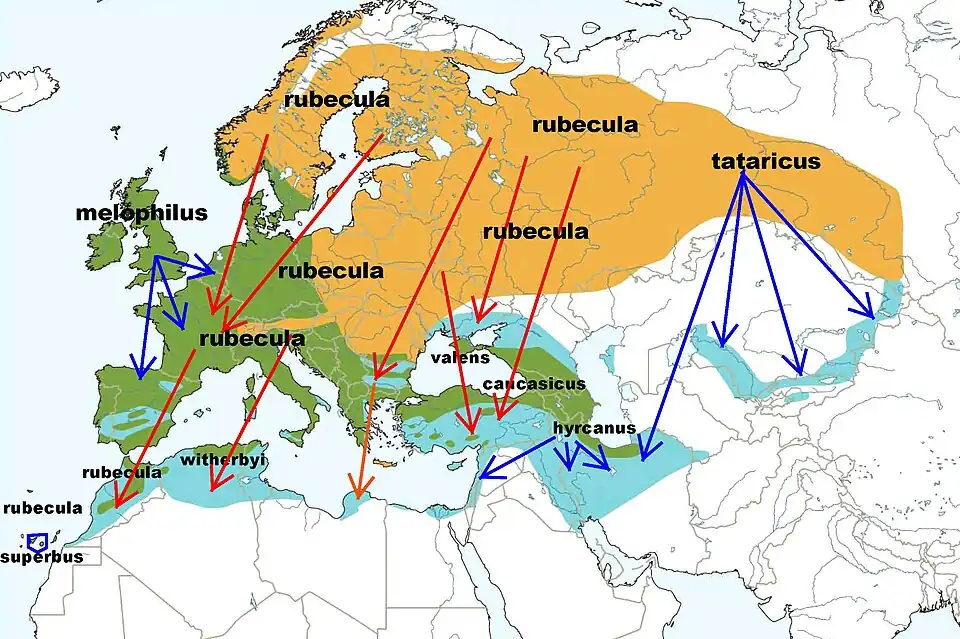 - ↑ Verheyen, R (1956). Sur la provenance des Rouges-Gorges, Erithacus rubecula (L.) observés l'hiver en Belgique. Gerfaut 46, 143-150.