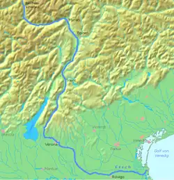 | Afluenți | Passirio[*], Isarco, Avisio[*], Plima[*], Valsura[*], Noce[*], Fersina[*], Saldura[*], Rambach[*], Rio Solda[*], Rio Senales[*], Canale Camuzzoni[*], Fossa Grande di Caldaro[*], Fossa di Bronzolo[*], torrente Leno[*], Rio Cameras[*], Rio Nero[*], Rio Puni[*], canale Biffis[*], rio Melz[*] |