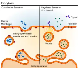 Exocitoza ce are loc la sinapsele chimice neuronale este dependentă de Ca2+ și deservește semnalizarea interneuronală. Exocitoza constitutivă are loc în toate celulele și servește fie la eliberarea unor substanțe în afara celulei, fie la livrarea către membrana celulară a unor proteine nou-sintetizate.