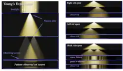 De vreme ce fotonii trec unul câte unul, unii printr-o fantă, alții prin cealaltă, ar trebui ca ei să lase o urmă cu doua dungi pe perete, dar nu se-ntâmplă acest lucru. În schimb aceștia creează în mod misterios mai multe dungi. Acesta ar fi rezultatul așteptat atunci când o rază constantă de lumină: s-ar răspândi pe perete ca o undă.