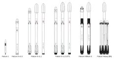 De la stânga la dreapta, Falcon 1, Falcon 9 v1.0, trei versiuni ale Falcon 9 v1.1, trei versiuni ale Falcon 9 v1.2, dui versiuni ale Falcon 9 Block 5,și Falcon Heavy