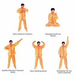 În afară de filozofia sa morală, Falun Gong constă în patru exerciții în picioare și unul de meditație șezândă. Exercițiile sunt privite ca secundare după perfecționarea caracterului, deși sunt totuși o componentă esențială a practicii de cultivare a Falun Gong.[19][36]