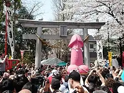 Falus purtat în cadrul paradei Kanamara Matsuri, trecând pe sub poarta-altar