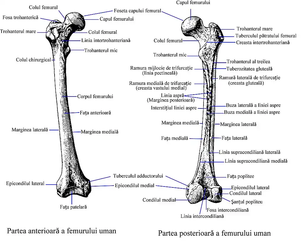 | Articulații | șold: acetabulumul pelvisului în partea de sus genunchi: cu tibia și patella în partea de jos |