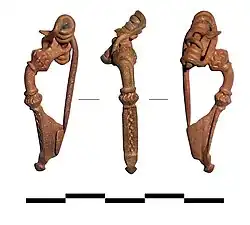 - Tip 7. Fibulă cu corpul și resortul dintr-o singură bucată, piciorul înfășurat, lățit și decorat cu un ornament de linii incizate