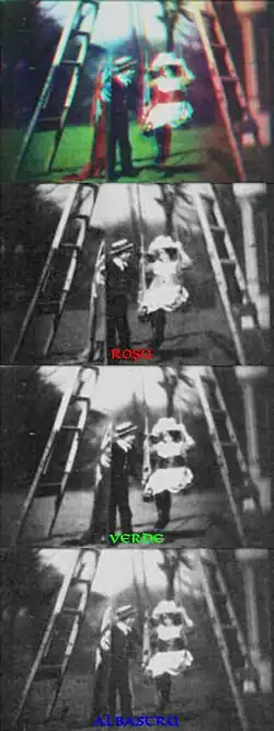 După cum se poate vedea în imaginea din dreapta, fidelitatea culorilor e remarcabilă (contrastele s-au păstrat, cadrul color fiind reconstituit din componentele lui în tonalități de gri). Obiectele fixe sunt bine conturate și colorate. Cu toate acestea, datorită mișcării ce a avut loc între expuneri succesive, cei doi copii apar neclari.