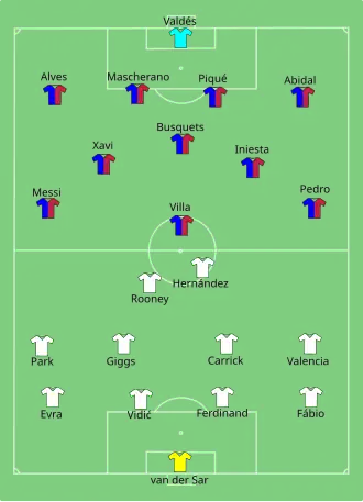 Barcelona a câștigat meciul 3 (marcate de Pedro, Messi și Villa respectiv) la 1 (marcat de Rooney), câștigând al patrulea trofeu UEFA Champions League.