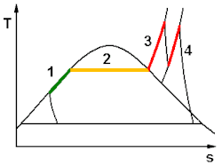 Transformările termodinamice care au loc într-un generator de abur, reprezentate într-o diagramă T-s: 1 preîncălzire apă, 2 fierbere, 3 supraîncălzire abur, 4 resupraîncălzire abur.