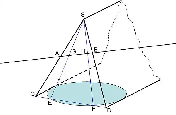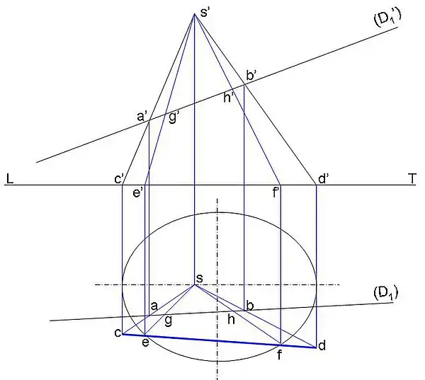 Epura realizată cu ajutorul a două vederi, o vedere frontală (din față) și o vedere orizontală, cele două vederi fiind separate de o linie orizontală (LT), punctele de intersecție sunt reprezentate în (G, H):
