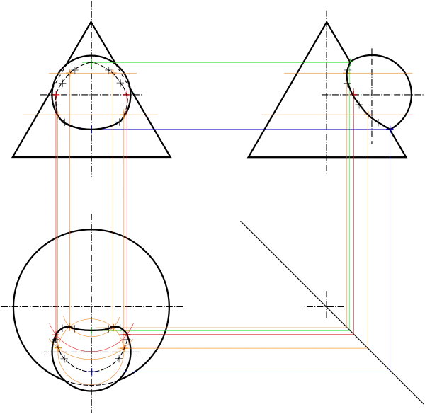 Intersecția a două volume (de exemplu o gaură care trece printr-o suprafață sau prin două piese sudate) urmează adesea o curbă „complexă”. Desenul acestei curbe necesită reperarea punctelor pe două proiecții: punctul aparține celor două volume, una dintre vederi va da cota, iar cealaltă va da depărtare.