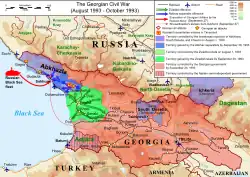 Războiul georgiano-armean din 1918, care a izbucnit din cauza unor provincii disputate între Armenia și Georgia, populate majoritar de armeni, s-a încheiat datorită intervenției britanice. În anii 1918-1919, generalul georgian Giorgi Mazniashvili a condus un atac împotriva Armatei Albe conduse de Moiseev și Denikin pentru a revendica litoralul Mării Negre de la Tuapse la Sochi și Adler pentru Georgia independentă. În 1920, Rusia Sovietică a recunoscut independența Georgiei prin Tratatul de la Moscova. Dar această recunoaștere s-a dovedit a fi de puțină valoare, deoarece Armata Roșie a invadat Georgia în anul 1921 și a anexat-o oficial în Uniunea Sovietică în anul 1922.[42]