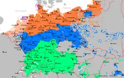 Dialectele limbii germane vorbite în Europa Centrală și de Est înaintea celui de-Al Doilea Război Mondial (se pot observa grupuri de germani din Regatul României de asemenea).