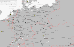 Comunități de sași și șvabi din Transilvania și Banat în Regatul României (începutul secolului al XX-lea, la 1918 mai precis); enclava nemarcată la nord-vest spre Satu Mare este un teritoriu tradițional și al șvabilor sătmăreni.