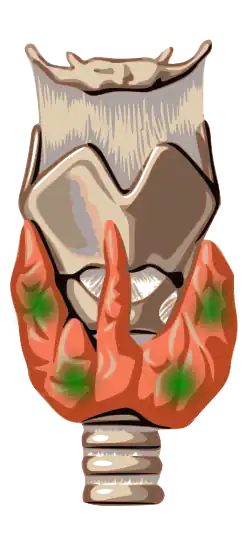 ![]() Thyroid and parathyroids as viewed from the front of the neck | |