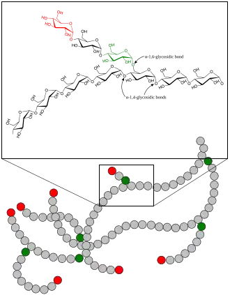 În acest caz, enzima denumită glicogen-fosforilază clivează legătura dintre un rest de glucoză terminală și o ramificație a glicogenului, prin substituția unei grupe fosforil dintr-o legătură de tipul α[1→4].[1]