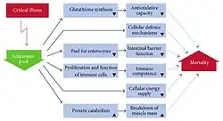 S-a considerat că suplimentarea cu glutamină are potențialul de a reduce complicațiile la persoanele care sunt grav bolnave sau care au suferit o intervenție chirurgicală abdominală, dar aceasta s-a bazat pe studii clinice de proastă calitate. Suplimentarea nu pare a fi utilă la adulți sau copii cu boala Crohn sau boală inflamatorie intestinală, dar studiile clinice din 2016 au fost insuficiente. Suplimentarea nu pare să aibă efect la sugarii cu probleme semnificative ale stomacului sau intestinelor.