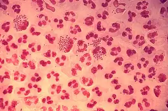 | Colorație Gram pe un frotiu, prelevat de la un pacient cu uretrită gonococică. | |